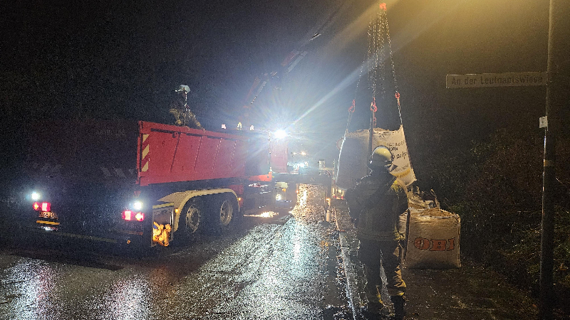 Der Wechsellader mit Mulde wurde von der ersten Einsatzstelle zur Unterstützung des Bauhofes abgezogen. Es mussten Bigpacks gefüllt mit Sand vom Bauhof zum Neubau des Deiches im Silbernkamp transportiert werden.