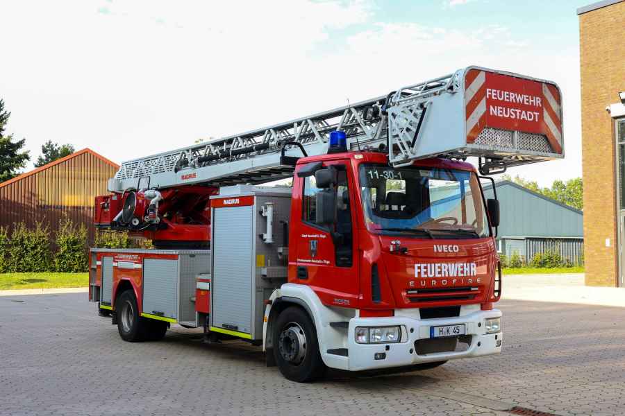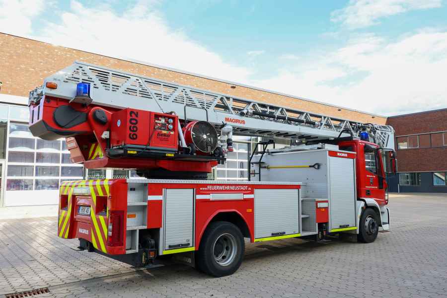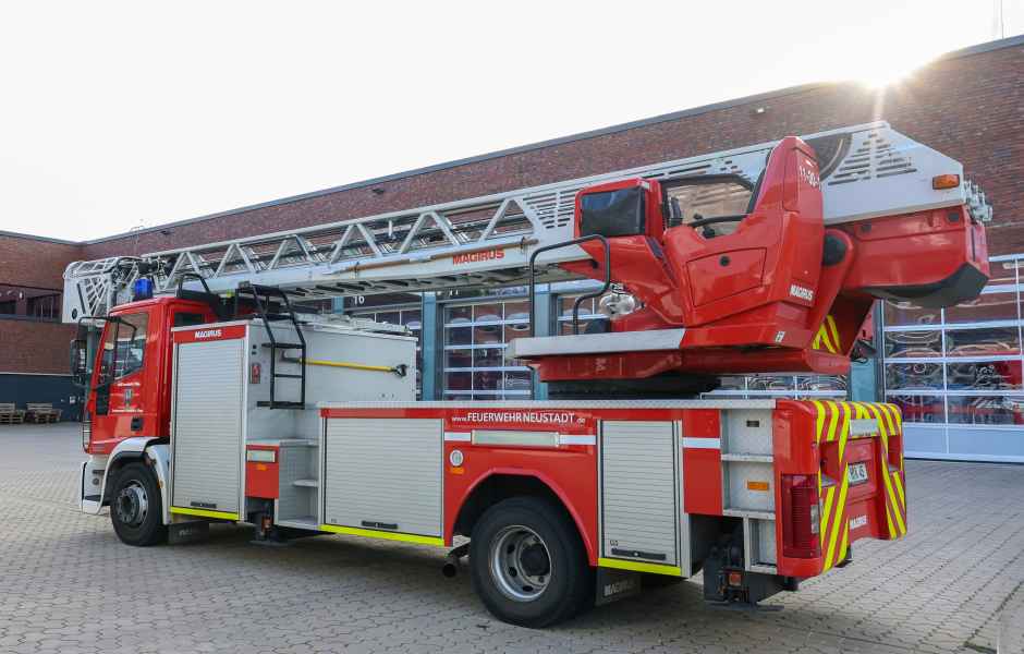 Die Drehleiter erreicht bei einem Abstand von 12 Meter zum Objekt eine Höhe von 23 Meter. Wird sie voll ausgefahren, erreicht sie eine Höhe von 30 Meter.