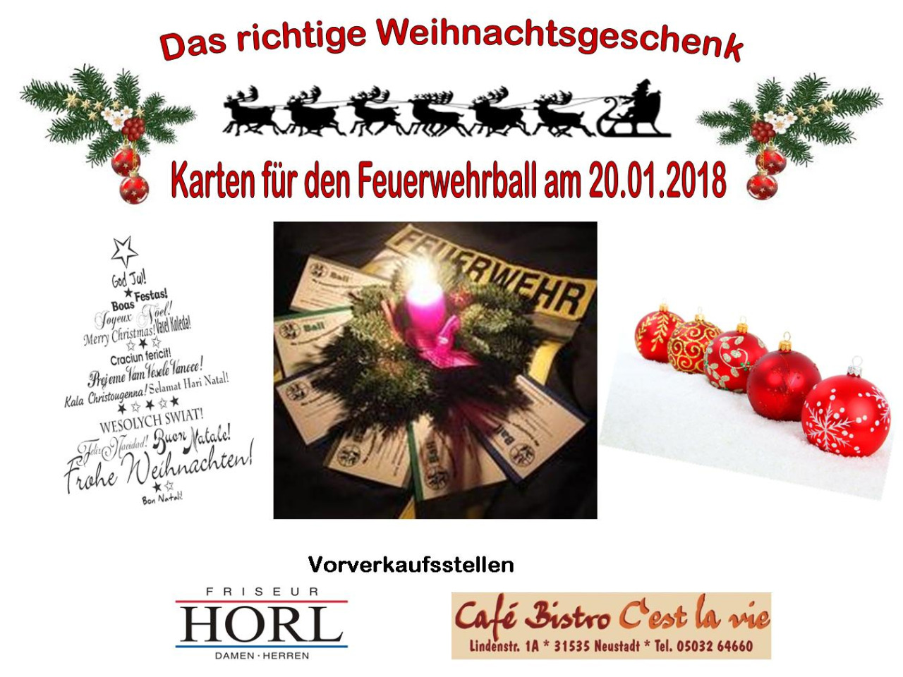 Für diejenigen die Interesse haben oder vielleicht auch noch nicht wissen was sie zu Weihnachten schenken sollen, der Kartenvorverkauf hat am Freitag 24.11.2017 begonnen. Ab sofort ist es möglich die Karten für den Ball beim Friseur Horl (Windmühlenstraße 13) oder beim Café Bistro C'est la Vie (Lindenstraße 1A) zu erwerben.