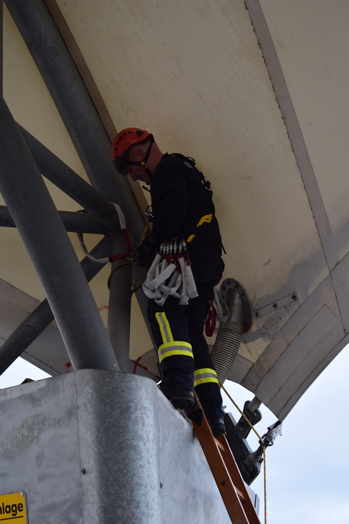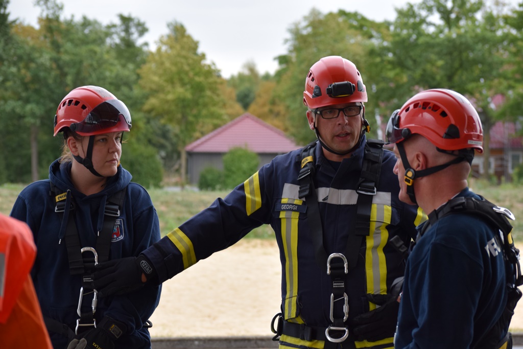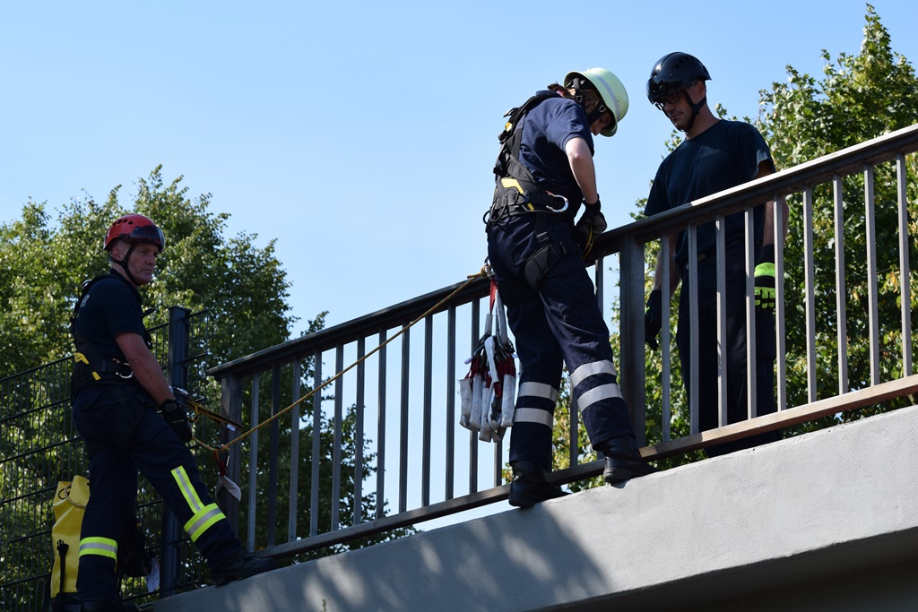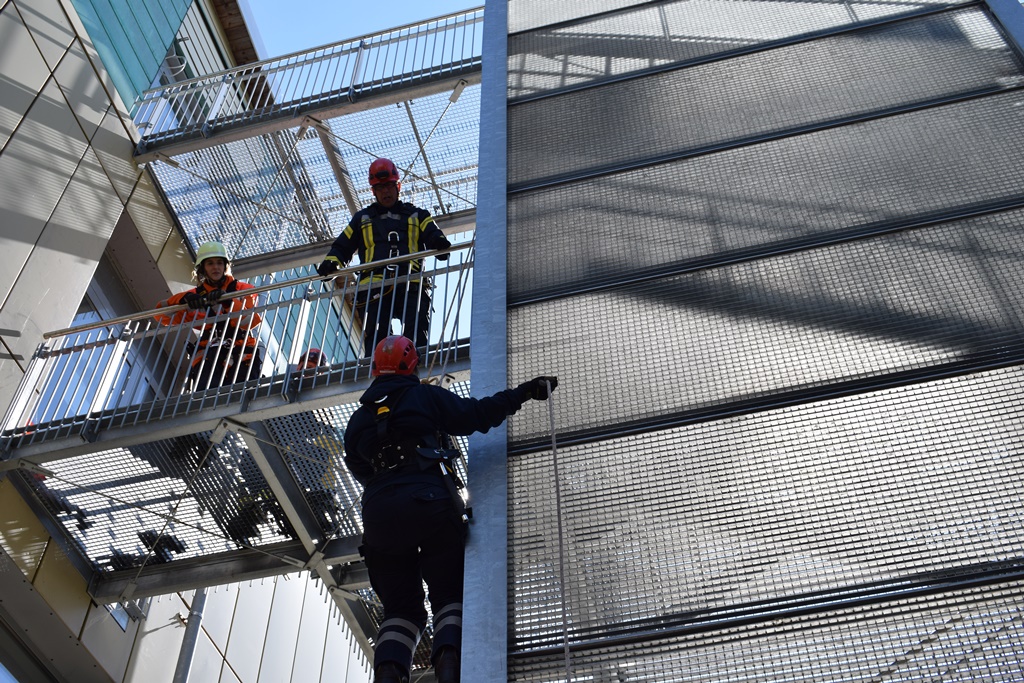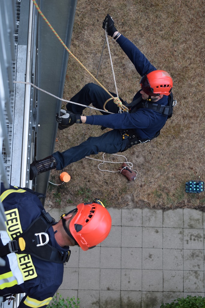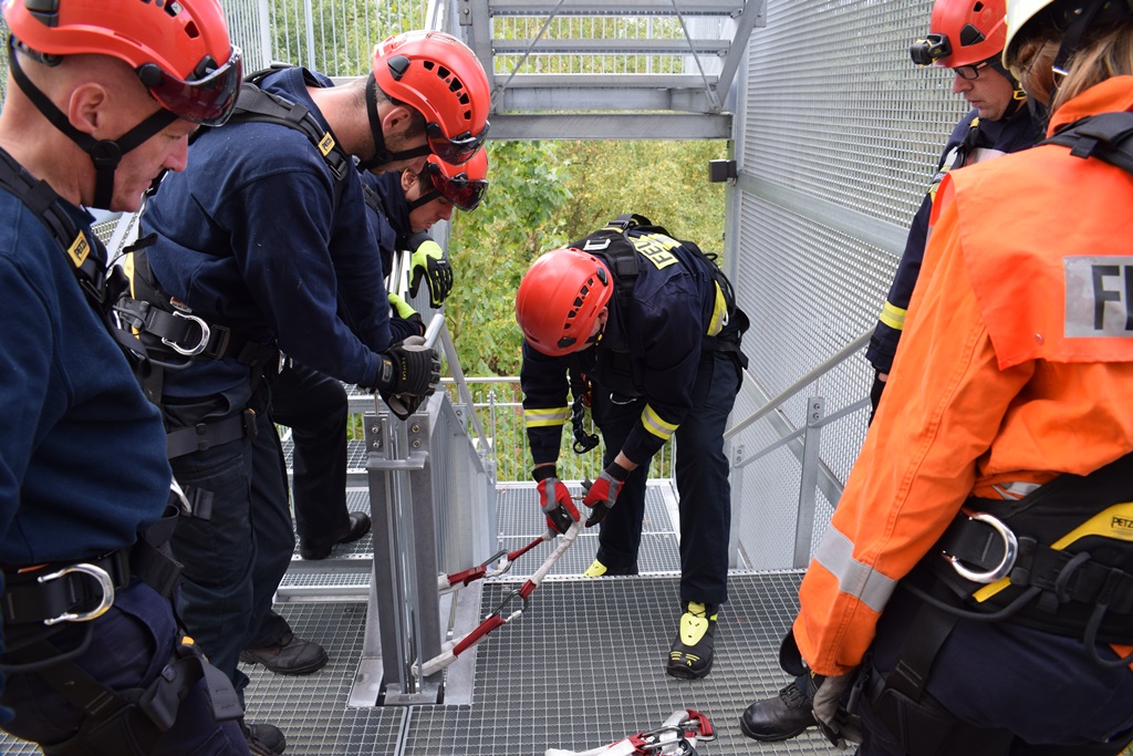 Am Ende mussten sich alle Teilnehmerinnen und Teilnehmer einer praktischen und theoretischen Prüfung unterziehen, die, zur Freude der Ausbilder, alle bestanden. Die erfolgreiche Teilnahme an dieser Fortbildung autorisiert die Feuerwehrfrauen und -männer, mit den speziellen Gerätschaften der Absturzsicherung zu arbeiten.