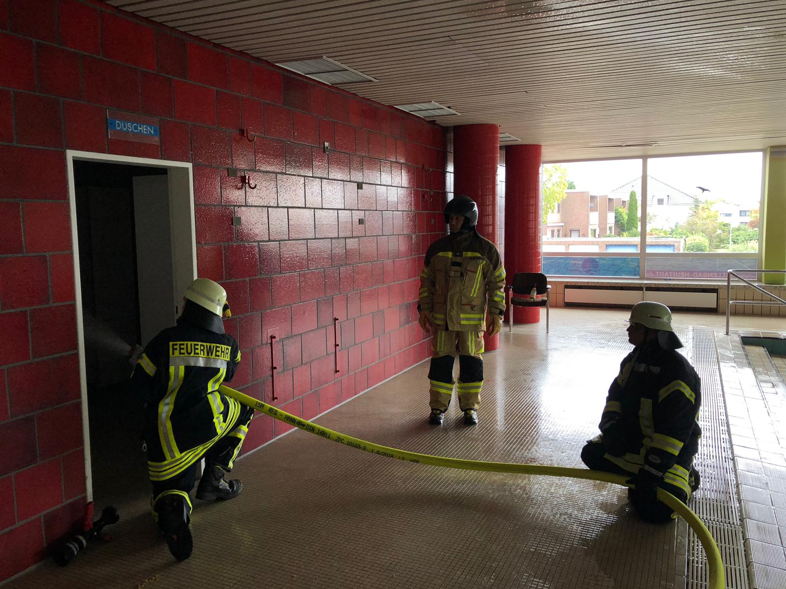 Im Anschluss folgte der praktische Teil der Ausbildung in das ehemalige Hallenbad nach Neustadt. Dort konnten die vorher vermittelten Inhalte praxisnah umgesetzt werden. Das richtige Vorgehen im Innenangriff, das korrekte Schlauchmangement sowie das gezielte Einsetzen von Wasser bei der Brandbekämpfung konnten so mehrfach trainiert werden.