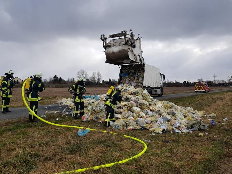Um kurz vor 13 Uhr wurde die Feuerwehr zu einem brennenden Müllwagen alarmiert. Der Müllwagen wurde auf einen naheliegenden Feldweg gefahren und dort entladen um an die Brandnester zu gelangen. Zwei Trupps unter Atemschutz zogen die Müllsäcke auseinander und löschten das Feuer ab.