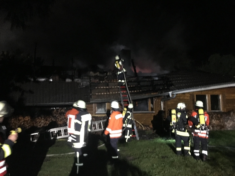 Dachstuhl des eingeschossigen Hauses bereits in Vollbrand. Es wurde mit ersten