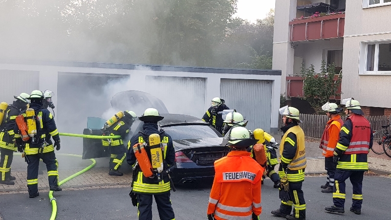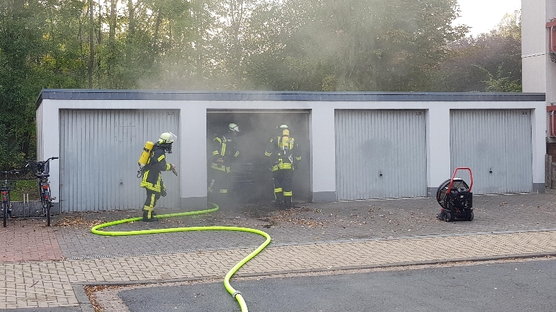 Es brannte ein PKW in einer Garage, die Feuerwehr hat den Pkw aus der Garage geschoben und mit Schaum abgelöscht.