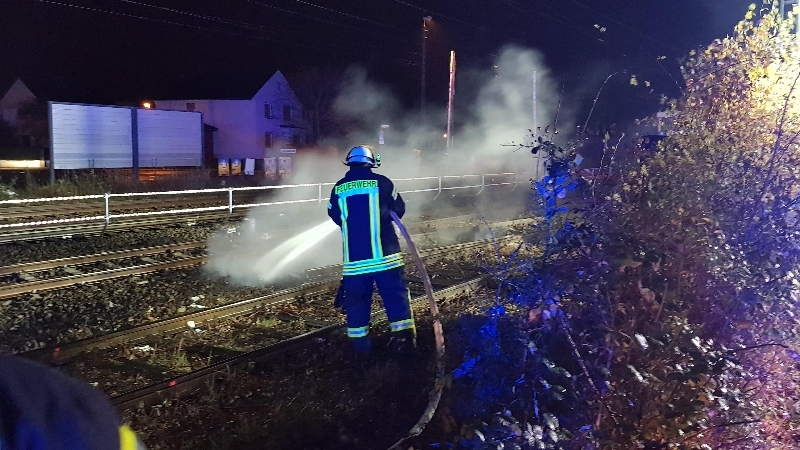 Es brannte im Bereich der Gleise, die Feuerwehr löschte den Kleinbrand mit einem C-Strahlrohr ab.