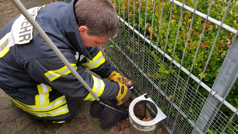 Die Feuerwehr hat das Tier mit einem Seitenschneider aus seiner Zwangslage befreit, nach der Befreiung ist das Tier geflüchtet.