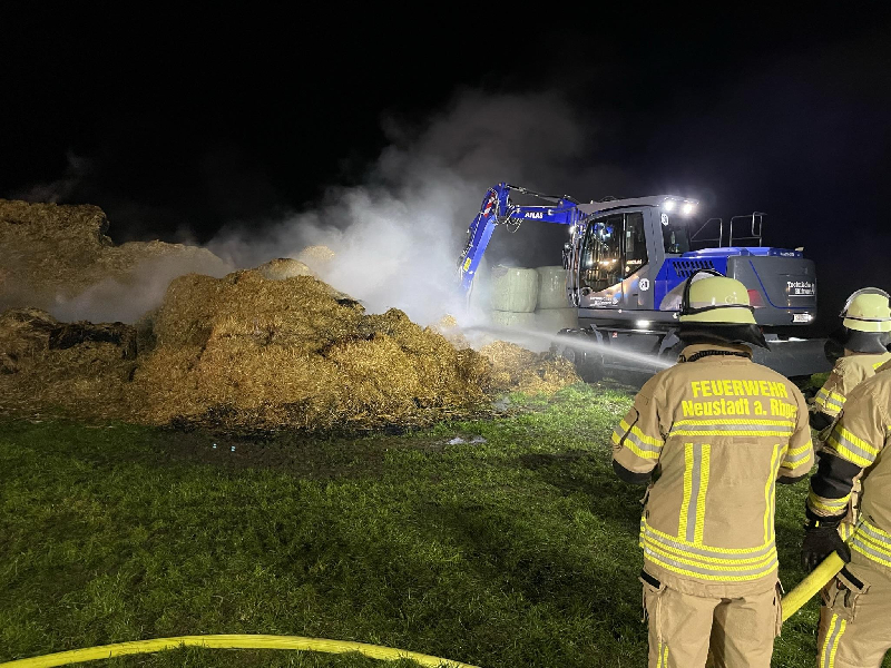 Es waren 4 C-Rohre und 1 B-Rohr im Einsatz um die Flammen niederzuschlagen. Zwischendurch war auch unter anderem ein Monitor (aufstellbarer Wasserwerfer)im Einsatz. Da die Strohballen stark gepresst waren, kam das Löschwasser sehr schlecht durch und der Löscherfolg war nicht gegeben. Dies bezüglich, wurde das THW mit einem Bagger alarmiert. Dieser zog die Strohballen aus-