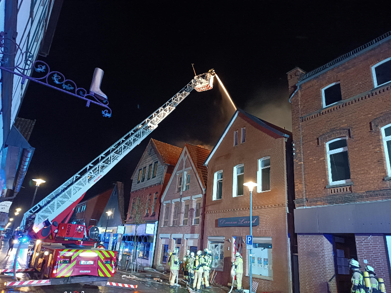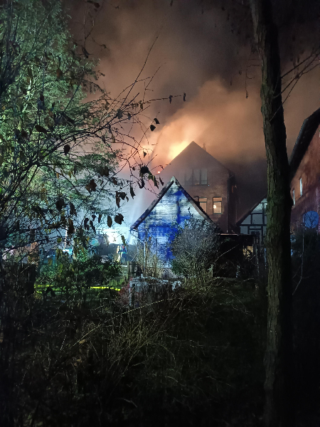 Kurz vor 6 Uhr wurde die Freiwillige Feuerwehr heute morgen zu einem Gebäudebrand in der Leinstraße alarmiert. Das Feuer war in dem leerstehenden Gebäude Nr. 2 ausgebrochen und griff schnell auf das unmittelbar danabenstehende Haus Nr. 4 über. Auf Grund dieser Lage und der engen Bebauung in diesem Bereich wurde die Alarmstufe auf b3 (Großbrand) erhöht, so dass weitere Ortsfeuerwehren zur Einsatzstelle alarmiert wurden. Da es im Haus Nr. 4 schnell zu einer Durchzündung kam und der Dachstuhl in Vollbrand stand, war es kaum noch möglich, die Trupps zum Innenangriff in die Gebäude zu schicken. Personen kamen glücklicherweise nicht zu schaden.