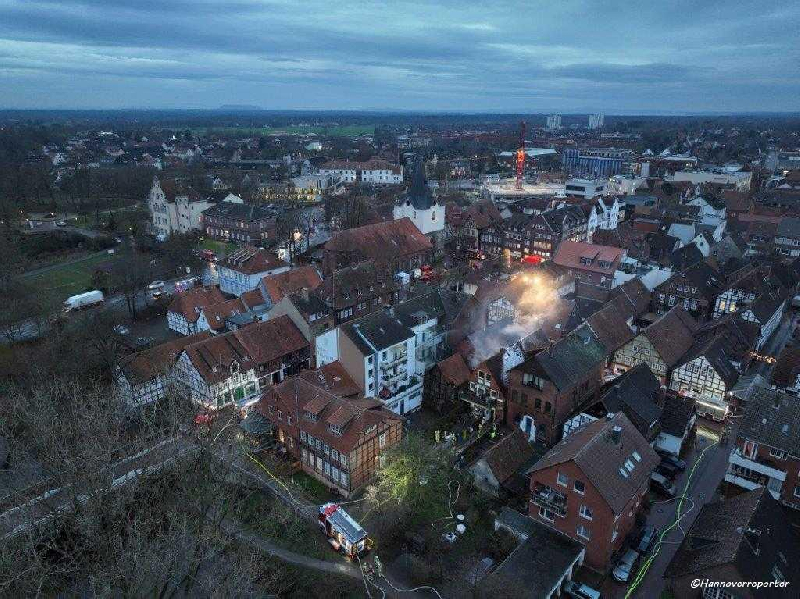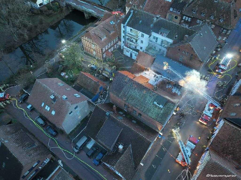 Die Feuerwehr bildete indes zwei Einsatzabschnitte und baute von zwei Seiten Riegelstellungen auf, um das Ausbreiten des Feuers auf die weiteren Häuser der Reihe zu verhindern. Von der Vorderseite an der Leinstraße wurden die Drehleitern aus Neustadt und Wunstorf in Stellung gebracht. Von der Rückseite wurde die Riegelstellung mit zwei B-Rohren aufgebaut, dabei wurde Wasser aus der Leine gefördert. Wegen der starken Rauchentwicklung wurde auch der gegenüberliegende Straßenzug geräumt. Gegen 8 Uhr war das Feuer unter Kontrolle, aber noch nicht gelöscht. Insbesondere beim Haus Nr. 4 war es schwierig, von