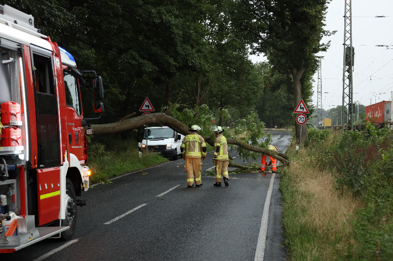 Die Feuerwehr wurde zu einem umgestürzten Baum zwischen Neustadt und Poggenhagen alarmiert. Beim Eintreffen der Einsatzkräfte bestätigte sich dieses. Der Baum blockierte auch einen Teil der Bahnstreckte, der Bahnverkehr wurde im gedrosselten Tempo an der Einsatzstelle vorbeigeführt. Nachdem eine Straßenhälfte frei gewesen war, musste ein Rettungswagen auf Alarmfahrt die Einsatzstelle zu einem medizinischen Notfall passieren.