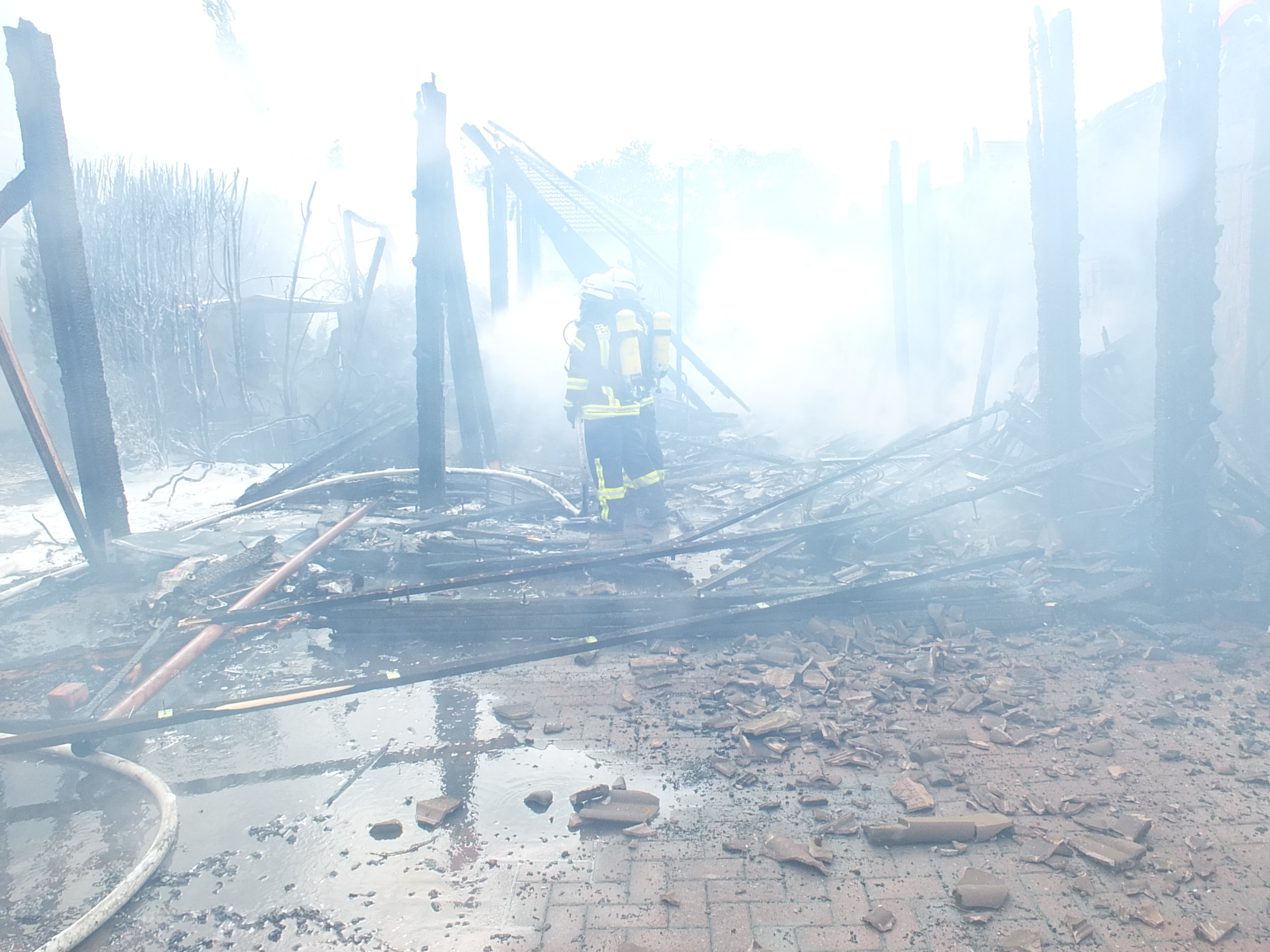 Bei dem direkt an den Carport grenzenden Hausanbau, der einen Billardkeller beherbergt, gelang dieses jedoch nicht. Durch die starke Hitze zersprangen auch dort die Fenster und die Holzvertäfelung in dem Gebäude fing Feuer. Es kam insgesamt zu einer sehr starken Rauchentwicklung, die das Arbeiten an der Einsatzstelle sehr unübersichtlich machte. Die Brandbekämpfung war auch von außen deshalb nur unter Atemschutz möglich, entsprechend viele Atemschutzgeräteträger waren notwendig.