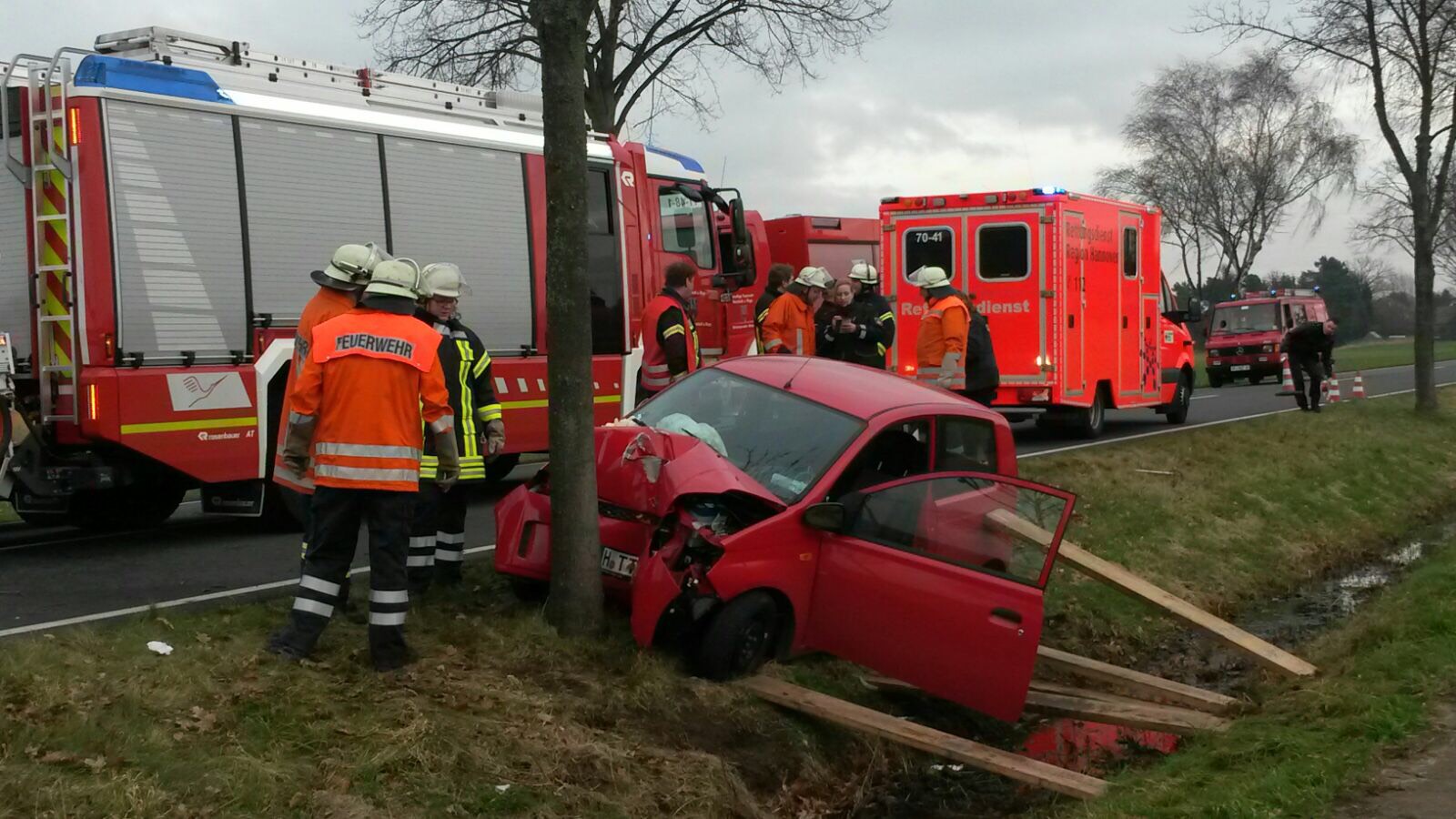 Am Mittwoch um 10:49 wurden wir zu einem Verkehrsunfall mit eingeklemmter Person auf der K314 alarmiert. Ein PKW war frontal gegen einen Baum geprallt. Vor Ort stellte sich heraus, dass die Person nicht eingeklemmt war, jedoch im Fahrzeug eingeschlossen. Wir befreiten die Person ohne technisches Gerät aus dem Fahrzeug und übergaben diese an den Rettungsdienst.
